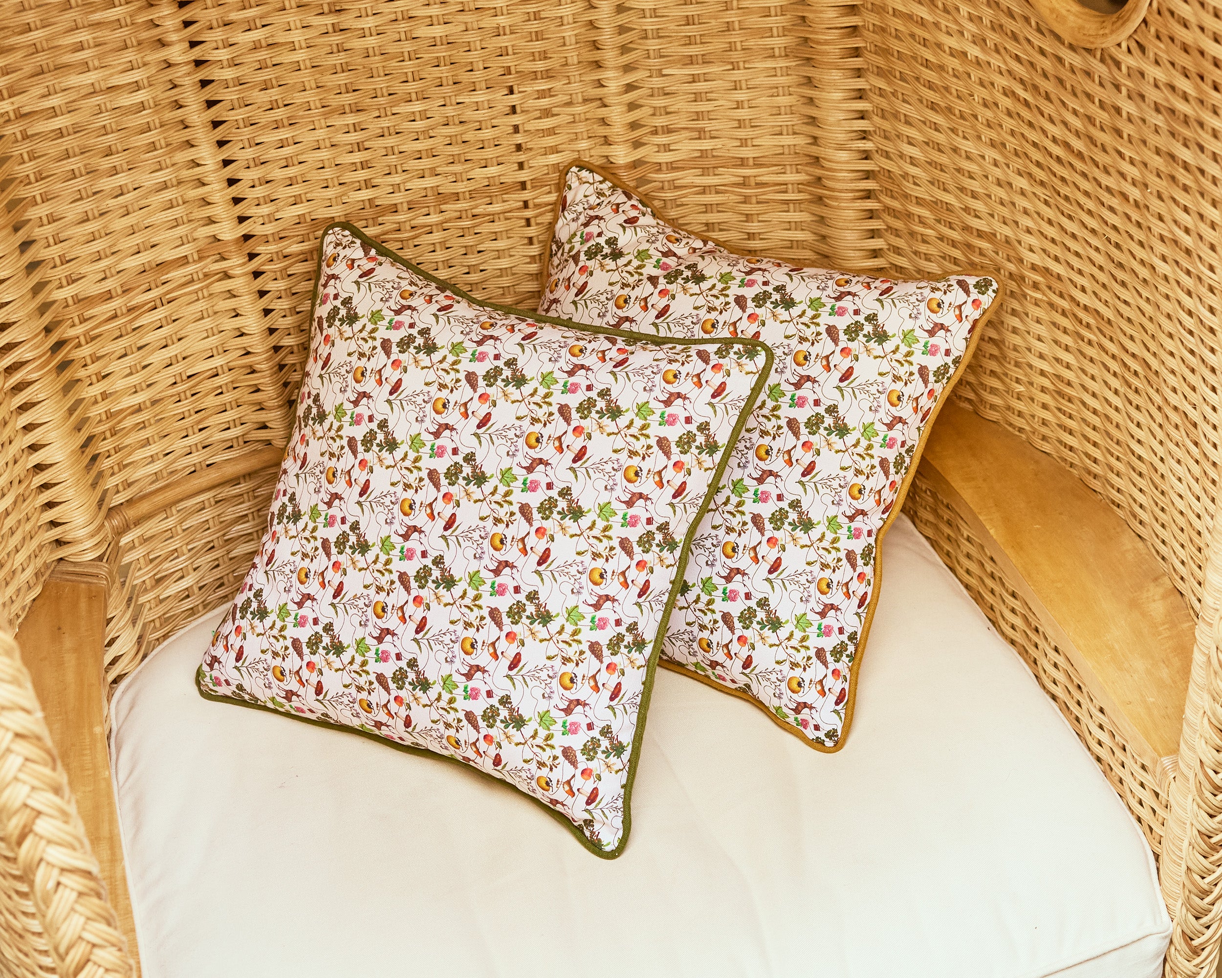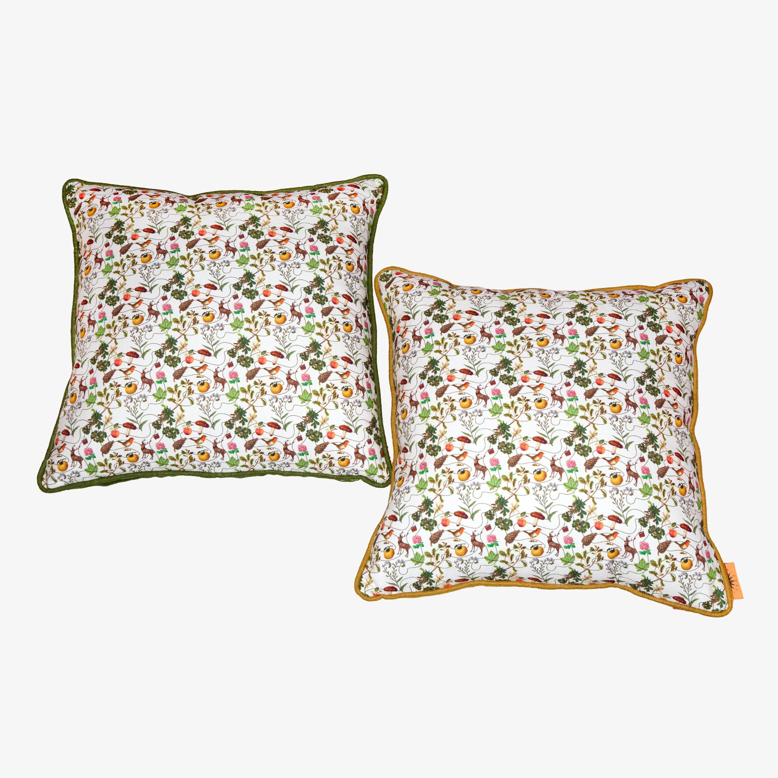 Coussin déhoussable en lin lavé de couleur vert kaki. Motifs Le Prince Jardinier x Le Bottin Mondain.