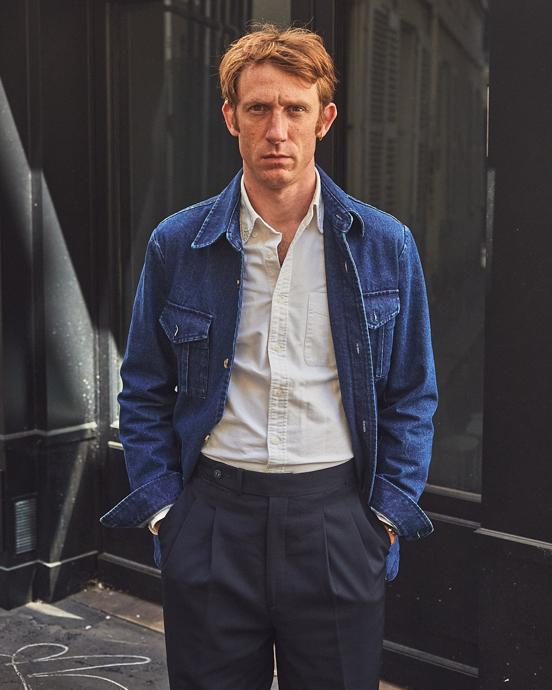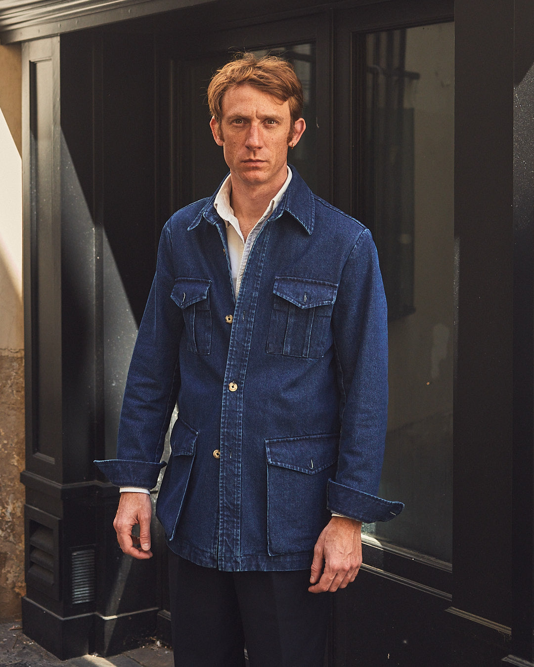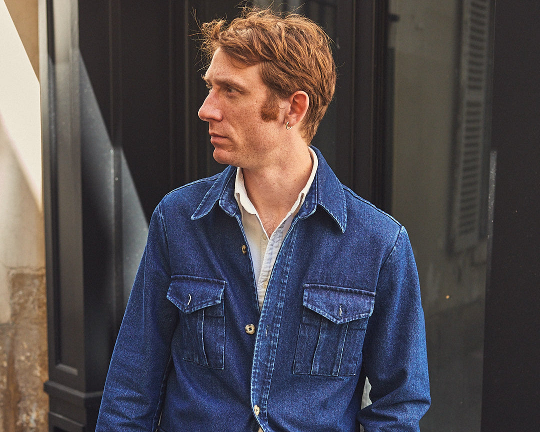 Veste de type saharienne, multi-poches, en denim. Pratique et originale, elle se porte en toute occasion.